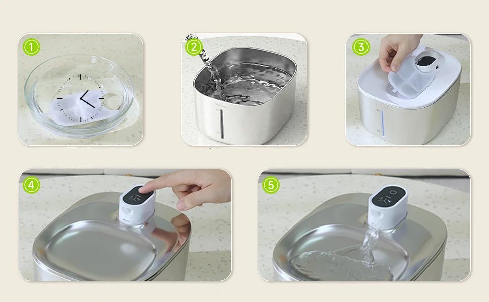Il est nécessaire de changer les filtres chaque mois. La fontaine est livrée avec 1 filtre. Ajoutez le pack de 4 filtres supplémentaires dans votre panier.